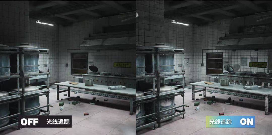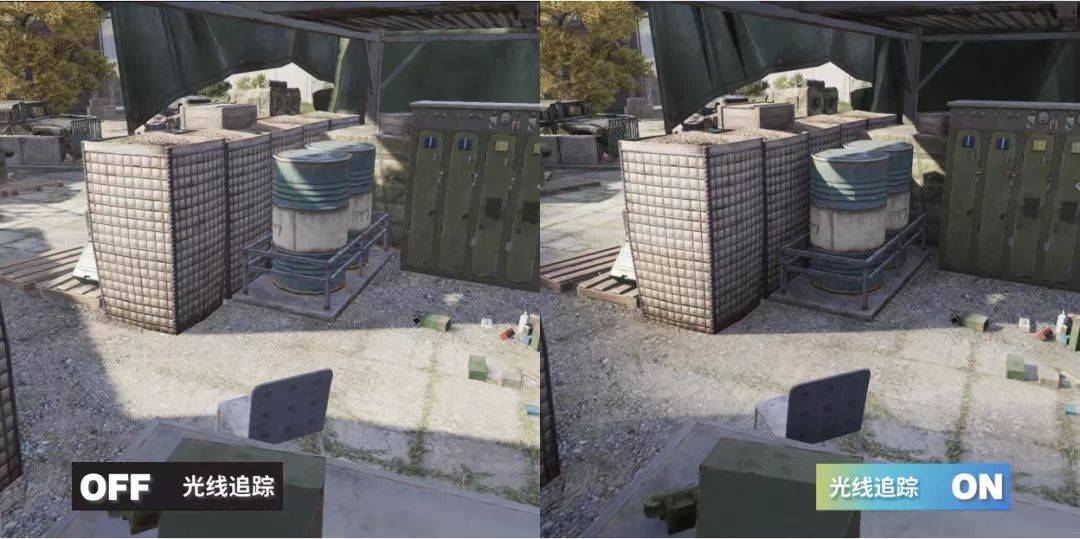 在《暗区突围》游戏中的实际应用上,在游戏环境的阴影效果方面, 室外的光线追踪阴影能够模拟真实的太阳光阴影形态,近处的阴影锐利,远处的阴影柔和。基于光线追踪的环境光遮蔽,能够体现出相交物体间的漫反射光线遮挡效果,进而强调出物体间的摆放关系,让画面更有层次感。相较于传统的环境光遮蔽技术,基于光线追踪的环境光遮蔽,由于可以获取到准确的场景信息,其能够更加精准地体现物体间的环境光遮蔽关系,避免传统技术中的黑晕等现象出现。更好的优化了玩家在游戏地图中的真实体验感。以高度还原自然光的品质为玩家提供更身临其境的战局感。