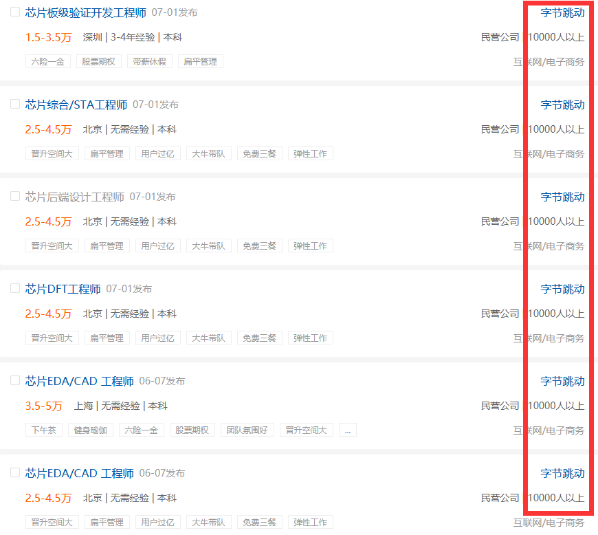 此前字节跳动在招聘网站上曾发布了包括芯片定制IP设计、芯片板级热设计工程师、芯片IT/CAD工程师、芯片后端设计工程师、SOC验证工程师、ASIC设计工程师等在内的多个岗位。