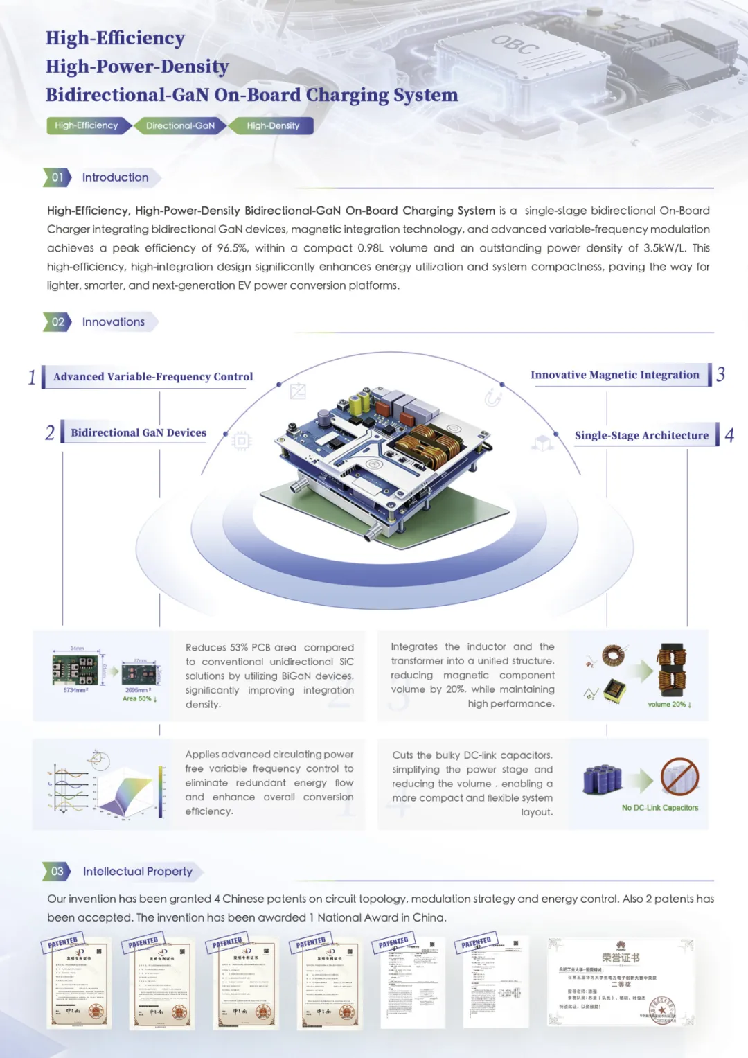 本次获奖项目由合肥工业大学电气工程系陈强教授领导的团队与珠海镓未来科技有限公司联合完成。合工大团队在电力电子拓扑与控制方面拥有深厚积淀,镓未来则提供高性能双向氮化镓功率器件与产业化支持。双方围绕器件—拓扑—控制—集成形成完整创新链条,共同攻克了双向 OBC 在效率、密度、可靠性等方面的关键技术难题。